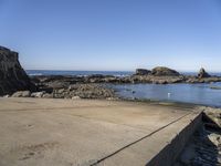 the stone walkway is leading to the beach and water's edge of a rocky coastline