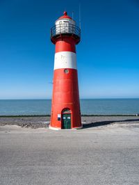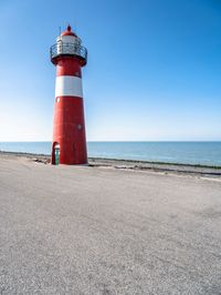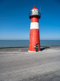 A peaceful day in the Netherlands reveals a lighthouse standing tall against a clear sky and a fluid landscape of lake, beach, and asphalt. The composite material of nature, ocean, and road blend together to form a picturesque view.