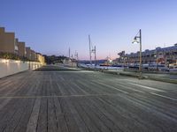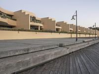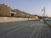 A stunning aerial view of a coastal city at dawn, with beautiful architecture and a clear sky.