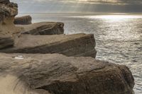 A stunning coastal cliff at dawn, with the sun visible on the horizon, illuminating the grey sky and casting a beautiful light on the rocky surface.