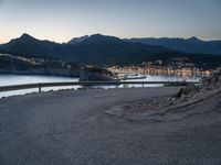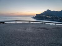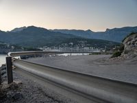 The Armco barrier curves around the elevated road, leading to a jetty and parking lot overlooking the stunning Mallorca coastline during the break of day in Spain, Europe.
