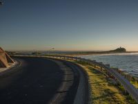 A scenic coastal road at dawn, winding through the highlands with a breathtaking view of the open ocean and clear sky.