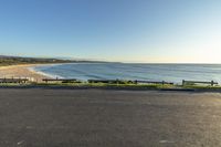 A serene coastal landscape at dawn, with sandy shores, clear sky, and calm ocean waves.