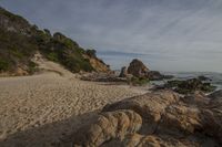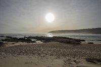 A stunning coastal landscape at dawn, showcasing the beautiful wood terrain and bedrock formations. The serene beach is surrounded by lush vegetation and tall trees, with the sun visible on the horizon, casting a warm sunlight over the sandy shore and clear ocean waters. This scenic spot offers plenty of recreational opportunities in nature's open space, perfect for enjoying the sunny atmosphere and breathtaking views of the mountain highland.
