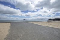 A breathtaking view of a coastal landscape with azure water, grey cumulus clouds, and a straight road leading into the horizon.