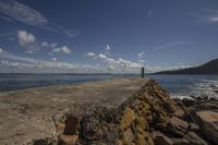 a lighthouse is on the edge of the water next to rocks and a seawall