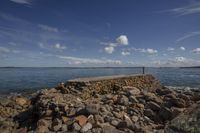 rocks surround the dock on a beach with a lone person standing next to it and looking out at the water