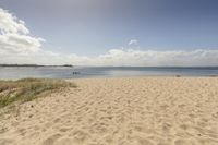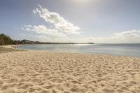A stunning coastal landscape with sand, water, and open space. This day photo captures the beauty of nature with trees, the ocean shore, and clouds in the horizon. The lush vegetation adds to the serene atmosphere of the beach.