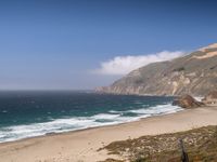 A scenic view of the winswept beach and mountain road in Big Sur, USA, with clear blue sky and clouds reflecting on the water surface, perfect for recreational activities and enjoying the beauty of nature.