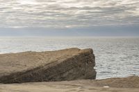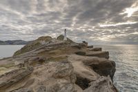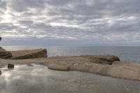 A stunning coastal landscape at dawn, featuring rocky cliffs, sandy beach, and the tranquil ocean waters.