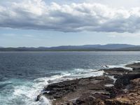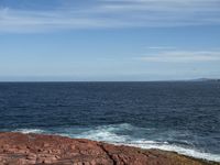 A stunning coastal landscape at Long Point in Merimbula, New South Wales, Australia. The sandy beach and crystal-clear azure water create a tranquil scene, framed by lush trees and rocky cliffs. The open space and clear sky allow for a breathtaking view of the horizon, with cumulus clouds and contrails adding to the picturesque scenery. The calm waves gently lap against the shore, while the rugged rock surface and bedrock formations add texture to the terrain. This idyllic coastal location is a perfect spot to enjoy the beauty of nature and relax by the water.