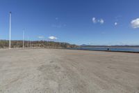 A scenic coastal landscape featuring open space, water, and an asphalt road under a clear sky.