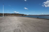 A stunning coastal landscape with an open space and harbor in the horizon. The clear blue ocean water and the cumulus clouds create a serene and beautiful scenery. The road surface, made of asphalt and concrete, leads to the harbor, while street lights illuminate the way. The calm and peaceful ambiance of this coastal area is perfect for nature lovers and those seeking a day of relaxation.