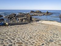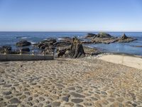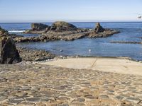 A summer day by the shore in Europe, with a clear sky and calm water. A boat ramp on the cobble stone beach, surrounded by rock formations, trees and sand. Automotive tires on the highway ramp leading to the coastal landscape.
