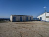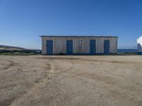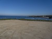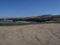 A view of the horizon along the coastline of Portugal, with a house, a road, a grass surface, sand, trees, and a clear sky.