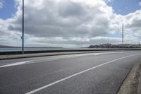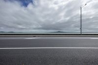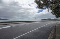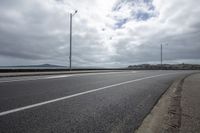 Scenic view of a coastal landscape with a road surface, street light, and overhead power line. The grey clouds and vegetation add to the natural beauty of the scene.