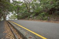 A scenic coastal landscape with a road winding through the trees on a gloomy day
