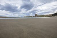 A beautiful coastal landscape with sand, water, and open space. The beach stretches out into the horizon, surrounded by the ocean and cumulus clouds in the sky.