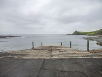 Scenic view of a coastal landscape with a wooded shoreline, calm lake, and cloudy sky
