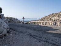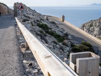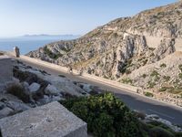 A view from above of an elevated road with Armco barriers winding through Mallorca in the Balearic Islands of Spain. The clear sky serves as a backdrop for the coastal landscape, with the ocean to one side and a low mountain range to the other.