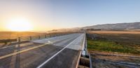 Scenic view of a coastal road at dawn in California, USA, with the asphalt road curving along the ocean coast. The clear sky and sunlight illuminate the landscape, highlighting the horizon and the bridge in the distance.