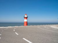 A tranquil landscape of the Dutch coast, featuring a composite material road, a lighthouse tower, and a bicycle wheel against a clear azure sky and calm ocean horizon.
