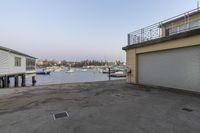 The dawn breaks over the coastal city, casting a warm glow on the pier and reflecting off the calm ocean waters.