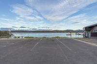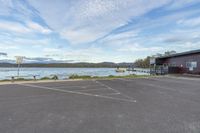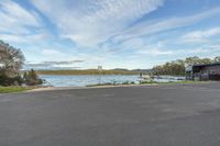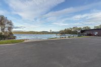 A scenic coastal view of a city with lush green vegetation, open spaces, and a road surface leading to a boat ramp and pier, surrounded by trees and grass. The clear blue sky and fluffy clouds reflect on the calm ocean waters, creating a serene atmosphere. Buildings with windows can be seen along the bank, adding to the urban landscape.