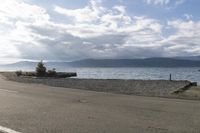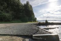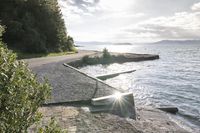 there is a motor bike parked along the beach near a small boat ramp and mountains on the side