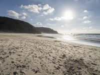 A sunny day in Portugal shows a beautiful landscape of sand, water, tree, vegetation, and open space at the shore of the ocean. The clear sky and azure water form a horizon, with a mountain and cumulus cloud in the background, and a road surface on the beach. The sun is visible, highlighting the highland, plain, water resources, and terrain of the natural environment.