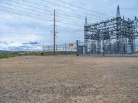 In the open spaces of Colorado, a power plant rises against a gloomy grey sky. The landscape is dominated by a dirt and gravel surface, creating a rugged and natural environment. The vast expanse of sand and dirt areas stretch out as far as the eye can see, contrasting with the industrial presence of the power plant. Nature reigns in this remote location, with the cloud-filled sky adding to the mysterious and atmospheric atmosphere.