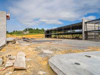 A view of a construction site with clouds in the background, featuring concrete surfaces and open spaces in a city.