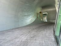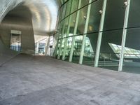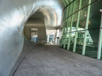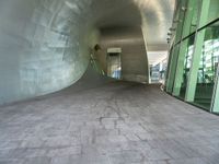 A composite material building with a ceiling, urban design, window, and symmetrical art in the Netherlands, Europe. The door, road surface, city, tints and shades, concrete, asphalt, architecture, facade, vegetation, glass, flooring, building material, transparency, road, circle, wood, space, room, design, office building, and shade make for a stunning piece of modern engineering.