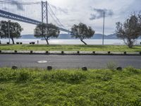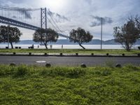 A sunny landscape showing a pier and bridge in Lisbon, Portugal. From the road, one can see the grass, trees, and waters of the coastal lake. The asphalt thoroughfare and infrastructure blend with the natural environment in the background.