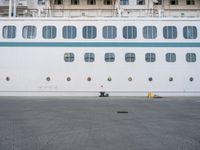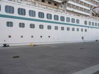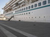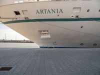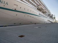 A modern cruise ship is docked at the pier in Bremerhafen, Germany. The ship is surrounded by the clear blue sky, a cobblestone courtyard, and a lake, with the landscape in the background. It is a representation of advanced naval architecture, vehicle, and water transportation, with its white, grey, and metal composite material, its asphalt and concrete surface, and its wood and metal infrastructure. Its facade features a pattern of tints and shades, while its windows, doors, and flaps, give it an aviation look.