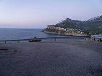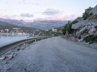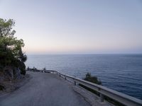 A scenic view of Spain's Mallorca Island in the Balearic Islands of Europe at the break of day, featuring a switchback along the coastal asphalt road with Armco barrier, a pier, harbor, jetty and a mountain landscape in the background. The night sky is illuminated by the street lights and the artificial lights from the harbor, giving way to a clear sky as the sun rises over the horizon.