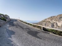 A winding road surrounded by the stunning natural landscape of Mallorca, Spain, an island in the Mediterranean Sea and part of the Balearic Islands in Europe, with an Armco barrier to protect from the coastal views of the clear sky and a calm ocean.