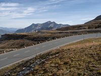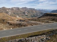 Aerial view of a curved asphalt road meandering through an elevated terrain of mountains, lakes, and open spaces in the highlands of Austria, Europe. Tar and trees line the road and clear sky overlooks the mountain landforms and switchback slope.