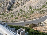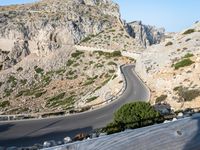 A stunning elevated view of a curved road leading to a mountain in Mallorca, Spain. The Armco Barrier stands in the foreground, with the coastal waters of the Balearic Islands in the background, providing a beautiful landscape of nature and clear sky.