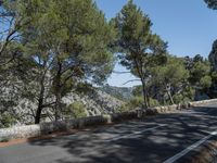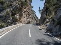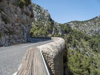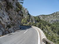 An aerial view of an S-curve of an elevated road with an Armco barrier and rock wall, surrounded by a canyon and clear sky in Mallorca, Balearic Islands, Spain. A top down profile of the landscape is seen, with the road straight down in the foreground.
