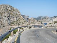 A winding road hugs the coastal landscape of Mallorca, a Balearic Island in the Mediterranean Sea. The asphalt curves around the mountain terrain with an Armco barrier, allowing for an unobstructed view of the clear blue sky and the glimmering ocean below.