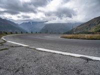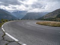 A winding road stretches through the rural landscape of Austria, surrounded by Armco barriers, mountains, and clouds on a sunny day. The straight road leads down to a low horizon.