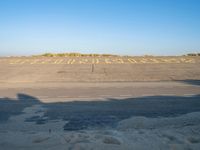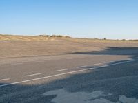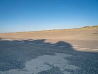 The calm of a winter morning in Holland reveals the coastal landscape of the Netherlands, including asphalt roads, sand dunes, and vegetation. The clear sky casts a shadow on the ocean, highlighting the changing colors and tints of the horizon, lake, and plateau. This is an example of geology and a natural environment in action, with the formation of aeolian landforms from freezing water resources, chemical compounds, and soil.