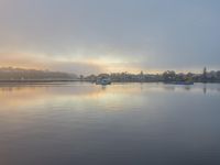 A stunning view of the gloomy dawn sky reflecting on the tranquil Lake Merimbula in New South Wales, Australia. The grey sky creates a gloom atmosphere, contrasting with the vibrant vegetation and open space along the Sapphire Coast. The calm waters of the lake and the sandy shore create a serene landscape, perfect for nature lovers and those seeking tranquility. A lone boat sits peacefully on the water, blending in with the natural beauty of the surroundings. The afterglow of the sunrise bathes the scene in warm sunlight, casting a magical glow on the entire coastal area.