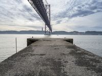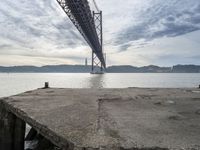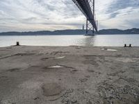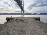 The break of day brings a calm to the beachside landscape in Lisbon, Portugal. A jetty pier and bridge span the lake, with a cloud-filled sky illuminated by sunlight. The shoreline is lined with trees, and the water and asphalt road surface reflect the tints and shades of the natural world.