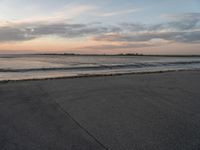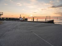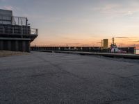 The sun rises above the city of Bremen, Germany, illuminating the asphalt road, the harbor, and the pier, as the lake and ocean meet in the distance. The azure sky creates a peaceful atmosphere, with the tree-lined coast of the Wadden Sea in the background. The early morning light illuminates the tar and muddy surface of the plain, creating a stunning break of day and a captivating landscape.