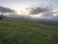 the sun is setting on top of the green mountainside with mossy rocks and grass