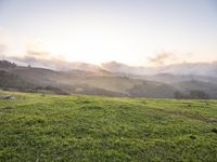 cows graze in green fields in the morning sundown on hills, with low clouds and fog