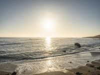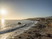 A breathtaking aerial view of the coastal landscape of California at dawn, with the golden sunshine illuminating the sandy beaches, clear blue ocean, and rocky shoreline, creating a stunning natural environment.