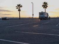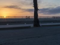 A stunning view of the city of Los Angeles at dawn, with the asphalt road leading to the parking lot at the coastal area. The sand, water, and open space create a picturesque scene, complemented by the trees and sunlight. The ocean shore, clouds, and horizon add to the beauty of the road surface surrounded by vegetation. The beach is bathed in the warm glow of the sun, casting shades on the lake. The atmosphere is serene, with black tar and palm trees accentuating the afterglow of the clear sky. The sunshine is visible, creating a breathtaking landscape with woody plants. Automobiles, with their tires and wheels, can be seen on the road.